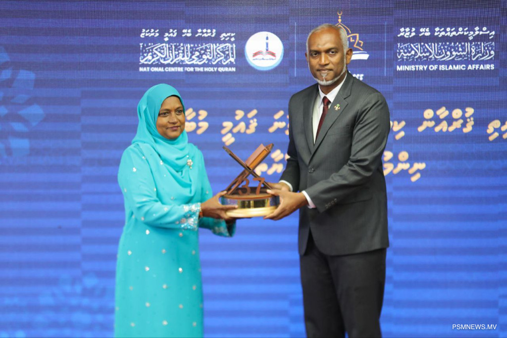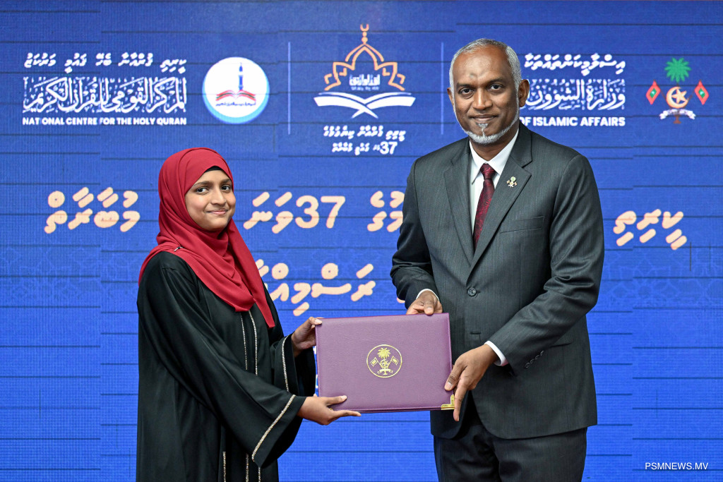 ކީރިތި ޤުރުއާން ކިޔެވުމުގެ 37ވަނަ ޤައުމީ މުބާރާތުގެ ޝަރަފުވެރި ވަނަތަކަށް ދިޔަ ބައިވެރިންނަށް އިނާމު ޙަވާލުކޮށްދެއްވީ ރައީސުލްޖުމްހޫރިއްޔާ ޑރ. މުޙައްމަދު މުޢިއްޒުގެ ދެކަނބަލުންނާއި ވަޒީރުންނެވެ.