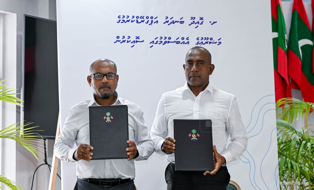 ށ. ގޮއިދޫގެ ބަނދަރު އަޕްގްރޭޑް ކުރުުމުގެ މަޝްރޫޢުގެ އެއްބަސްވުމުގައި އިމާރާތްކުރުމާއި ގެދޮރުވެރިކަމާއި ބިނާރާބެހޭ ވުޒާރާގެ ސްޓޭޓް މިނިސްޓަރ ހަސަން ރަޝީދު އަދި އެމްޓީސީސީ މެނޭޖިންގ ޑިރެކްޓަރ ޑީސީޕީ (ރިޓަޔާޑް) އަޙްމަދު ސަޢުދީ ސޮއިކުރެއްވުމަށްފަހު / ފޮޓޯ - ރައީސް އޮފީސް
