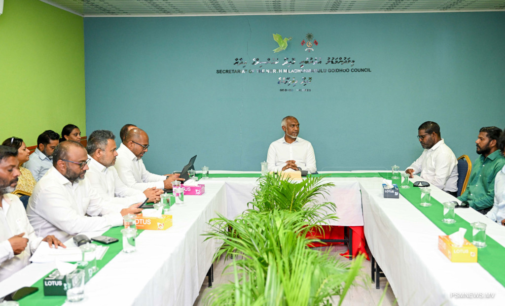 ރައީސުލްޖުމްހޫރިއްޔާ ޑރ. މުޙައްމަދު މުޢިއްޒު ށ. ގޮއިދޫ ކައުންސިލާއި، އ.ތ.މ ކޮމިޓީ އަދި ރަށުގެ މުއައްސަސާތަކުގެ އިސްވެރިންނާ ބައްދަލުކުރެއްވުން / ފޮޓޯ - ރައީސް އޮފީސް