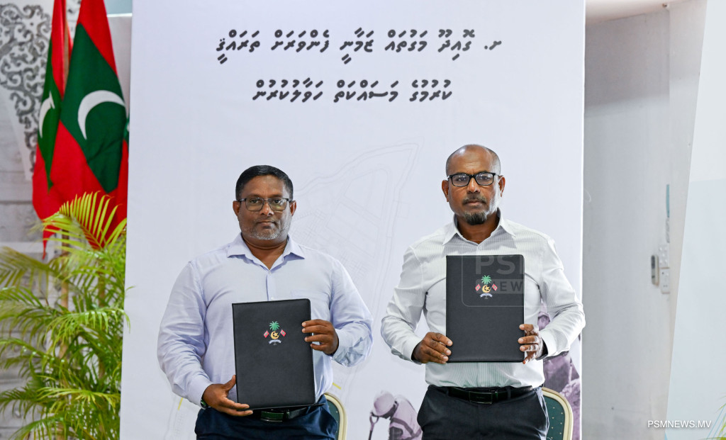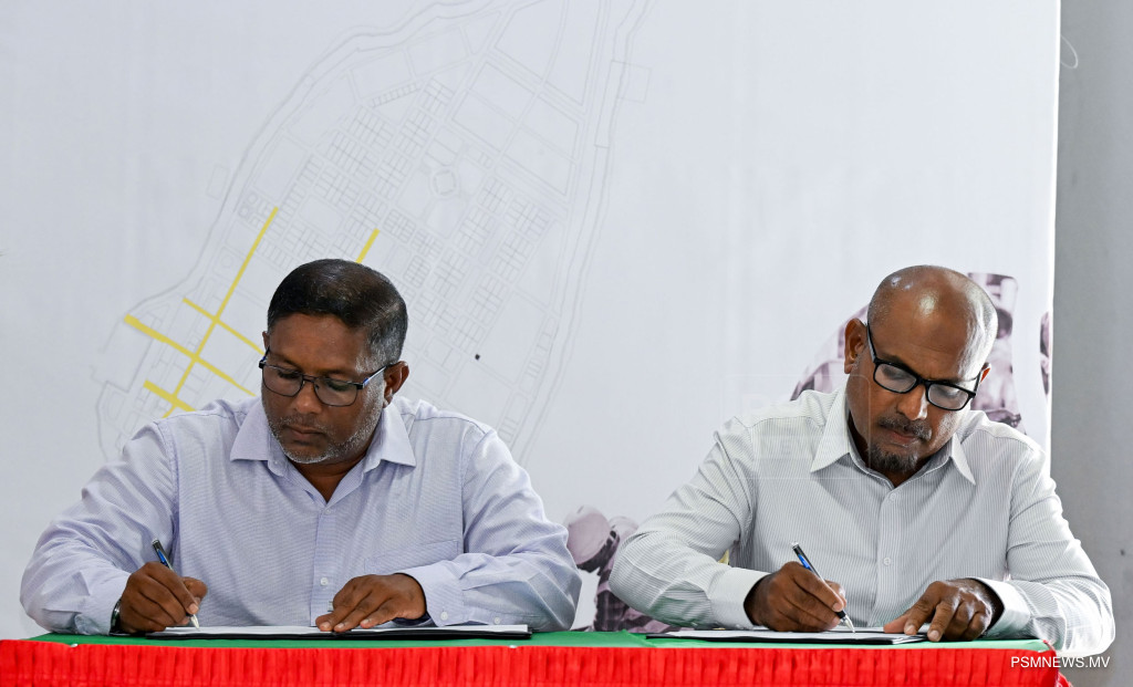 ށ. ގޮއިދޫ މަގުތައް ޒަމާނީ ފެންވަރަށް ތަރައްޤީކުރުމުގެ މަޝްރޫޢުގެ އެއްބަސްވުމުގައި އިމާރާތްކުރުމާއި ގެދޮރުވެރިކަމާއި ބިނާރާބެހޭ ވުޒާރާގެ ސްޓޭޓް މިނިސްޓަރ ހަސަން ރަޝީދު އަދި އާރުޑީސީގެ ފަ މެނޭޖިން ޑިރެކްޓަރ އިބްރާހީމް ނަޒީމް ސޮއިކުރެއްވަނީ / ފޮޓޯ - ރައީސް އޮފީސް
