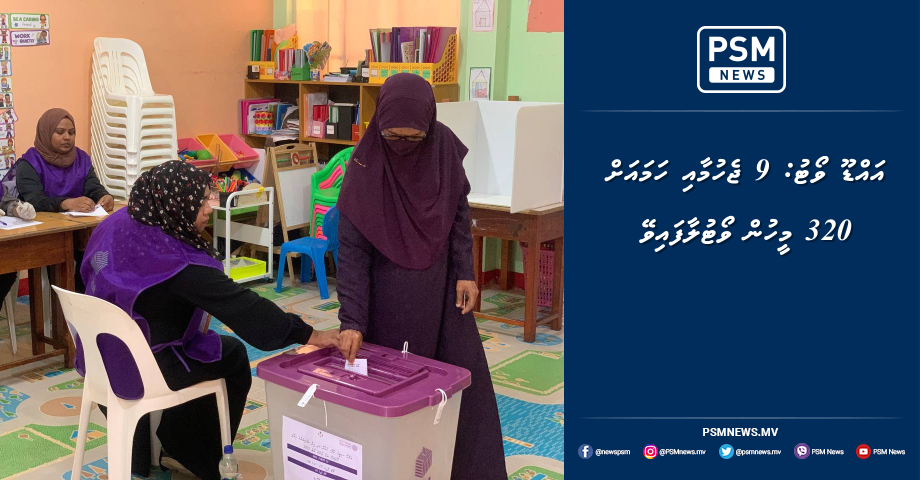 އިލެކްޝަންސް ކޮމިޝަނުން ވިދާޅުވީ މިއިންތިޚާބުގައި ވޯޓުލުމުގެ ހައްގު ލިބިފައިވާ 9256 މީހުންގެ ތެރެއިން 9 ޖެހުމާއިހަމައަށް 320 މީހަކު ވޯޓުލާފައިވާކަމަށެވެ. އޭގެ ތެރޭގައި ހިމެނެނީ 108 އަންހެނުންނާއި 212 ފިރިހެނުންނެވެ.