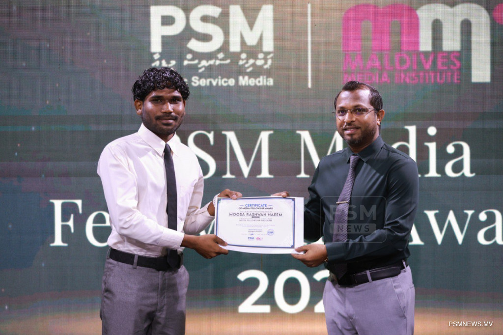 "ޕީއެސްއެމް މީޑިއާ ފެލޯޝިޕް 2025" އަށް ހޮވުނު ކުދިންނަށް އެކަމުގެ ލިޔުން ހަވާލުކޮށްދެއްވީ ޕީއެސްއެމްގެ މެނޭޖިންގ ޑިރެކްޓަރ އިބްރާހީމް ނަސްރީނެވެ.