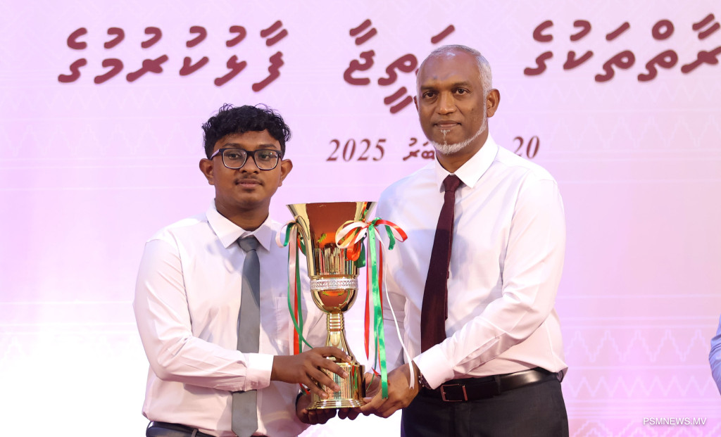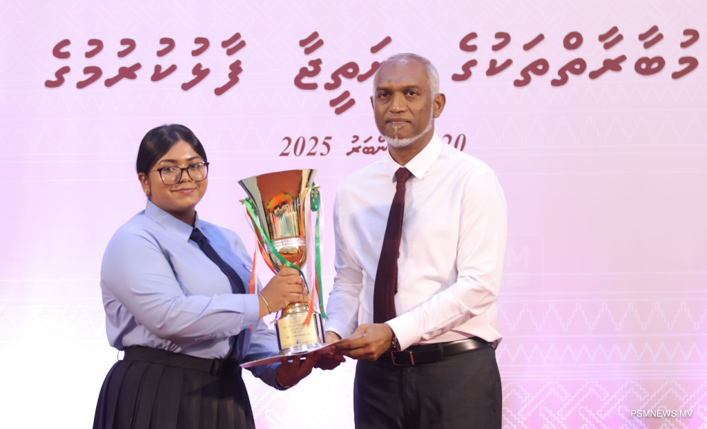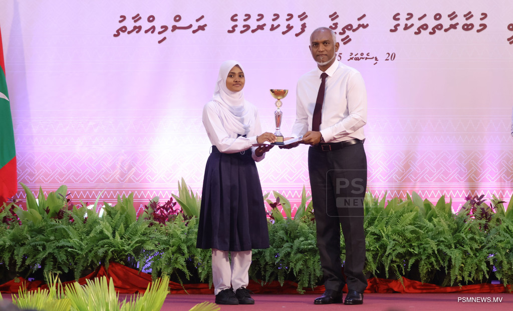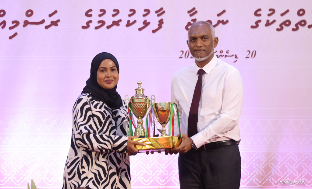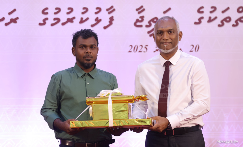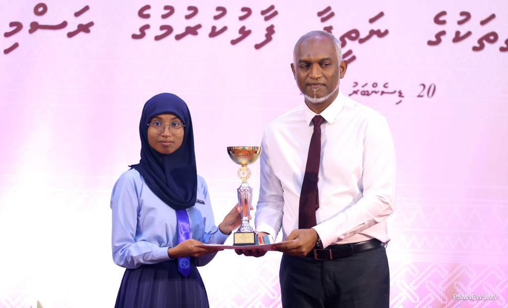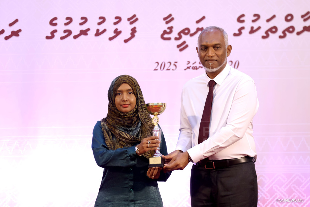 ޤައުމީ އަދަބީ މުބާރާތްތަކާއި އަތުލިޔުން މުބާރާތުގެ އިނާމް ދިނުމުގެ ރަސްމިއްޔާތުގައި ރައީސުލްޖުމްހޫރިއްޔާ ޑރ. މުޙައްމަދު މުޢިއްޒު އިނާމް ހަވާލުކޮށްދެއްވަނީ / ފޮޓޯ: މުޙައްމަދު ވަޙީދު، ޕީއެސްއެމް ނިއުސް