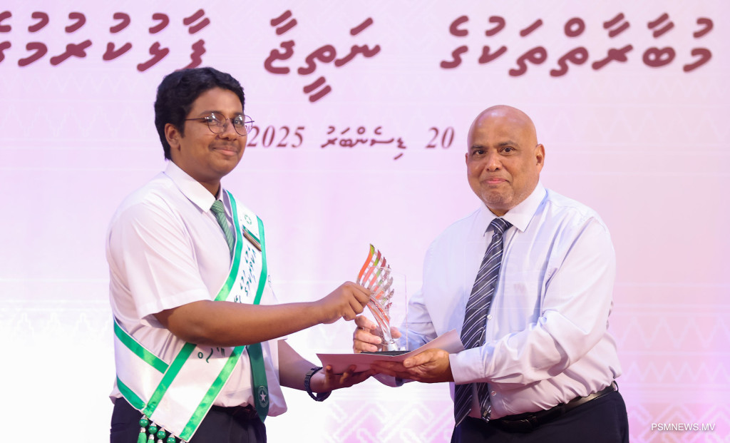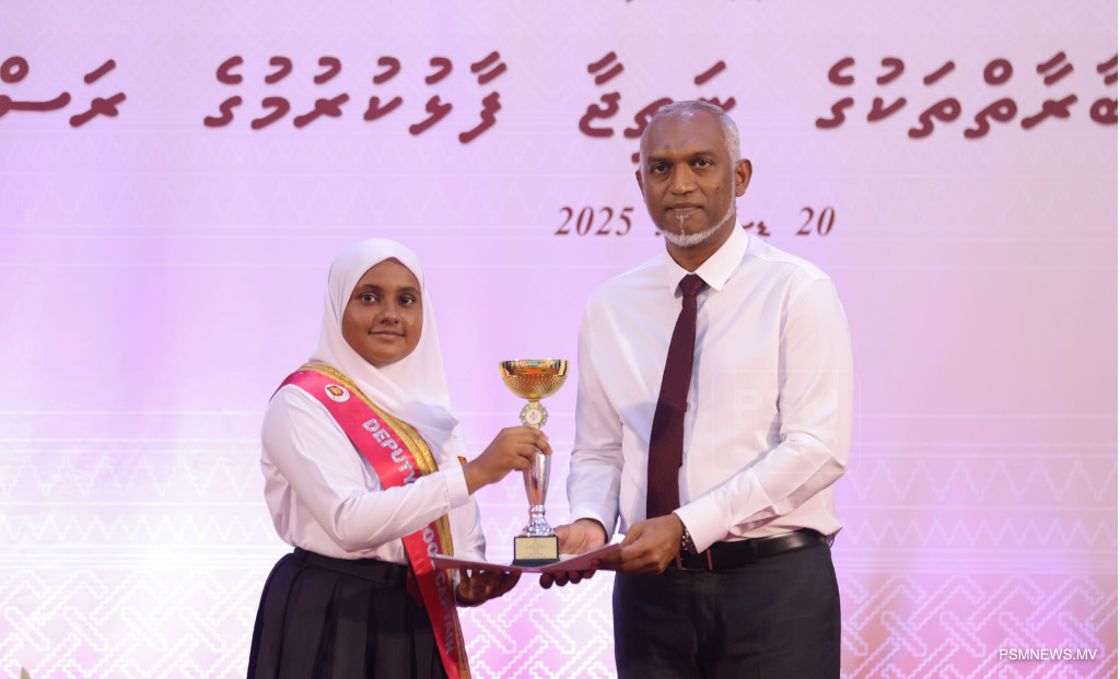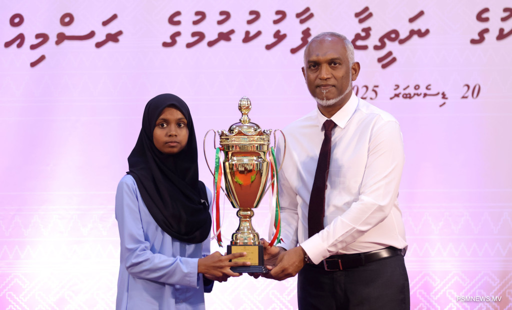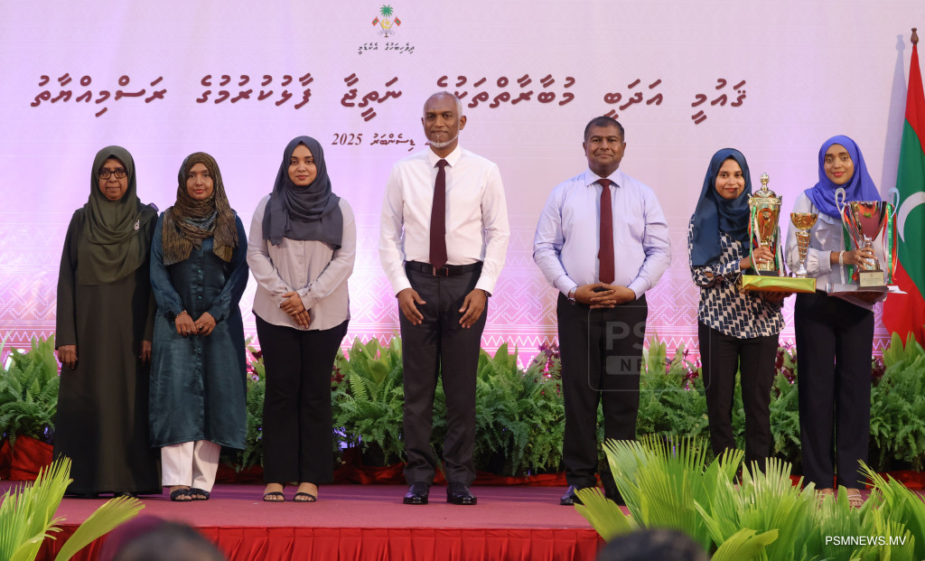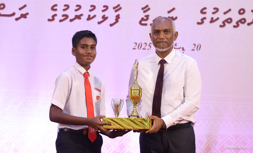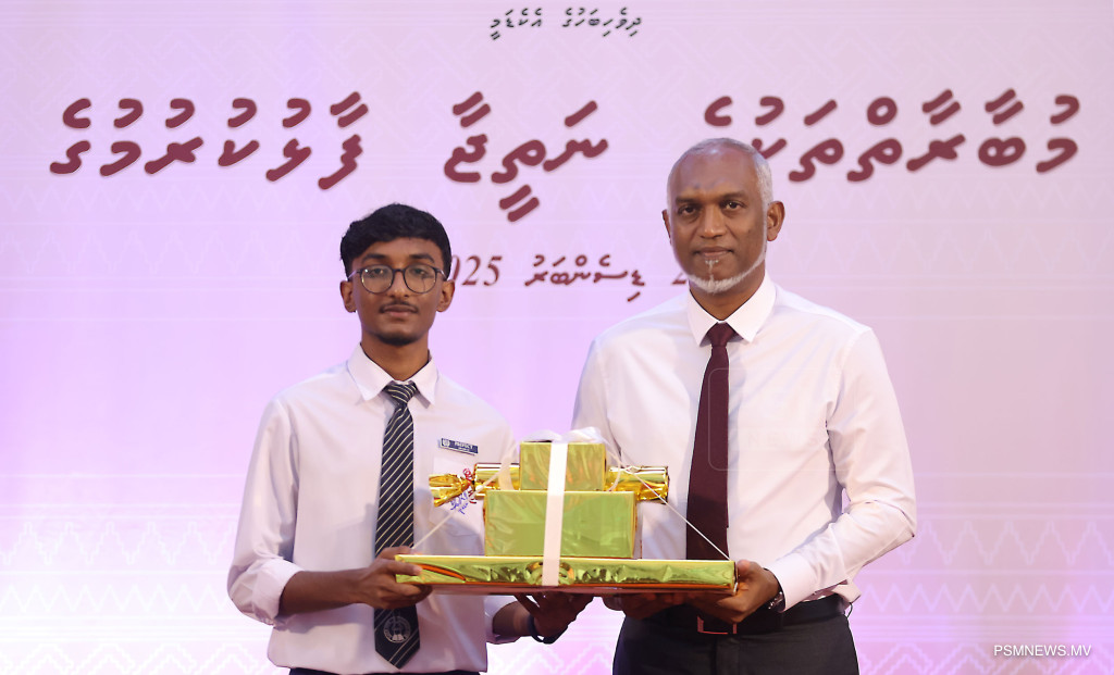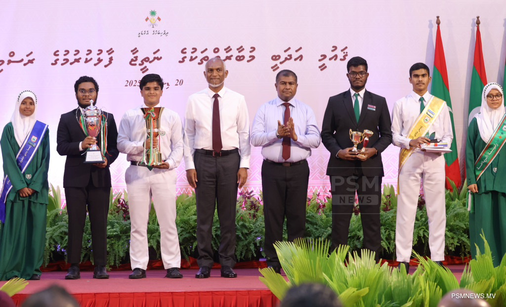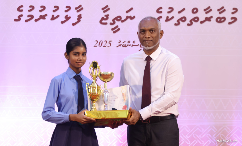 ޤައުމީ އަދަބީ މުބާރާތްތަކާއި އަތުލިޔުން މުބާރާތުގެ އިނާމް ދިނުމުގެ ރަސްމިއްޔާތުގައި ރައީސުލްޖުމްހޫރިއްޔާ ޑރ. މުޙައްމަދު މުޢިއްޒު އިނާމް ހަވާލުކޮށްދެއްވަނީ / ފޮޓޯ: މުޙައްމަދު ވަޙީދު، ޕީއެސްއެމް ނިއުސް